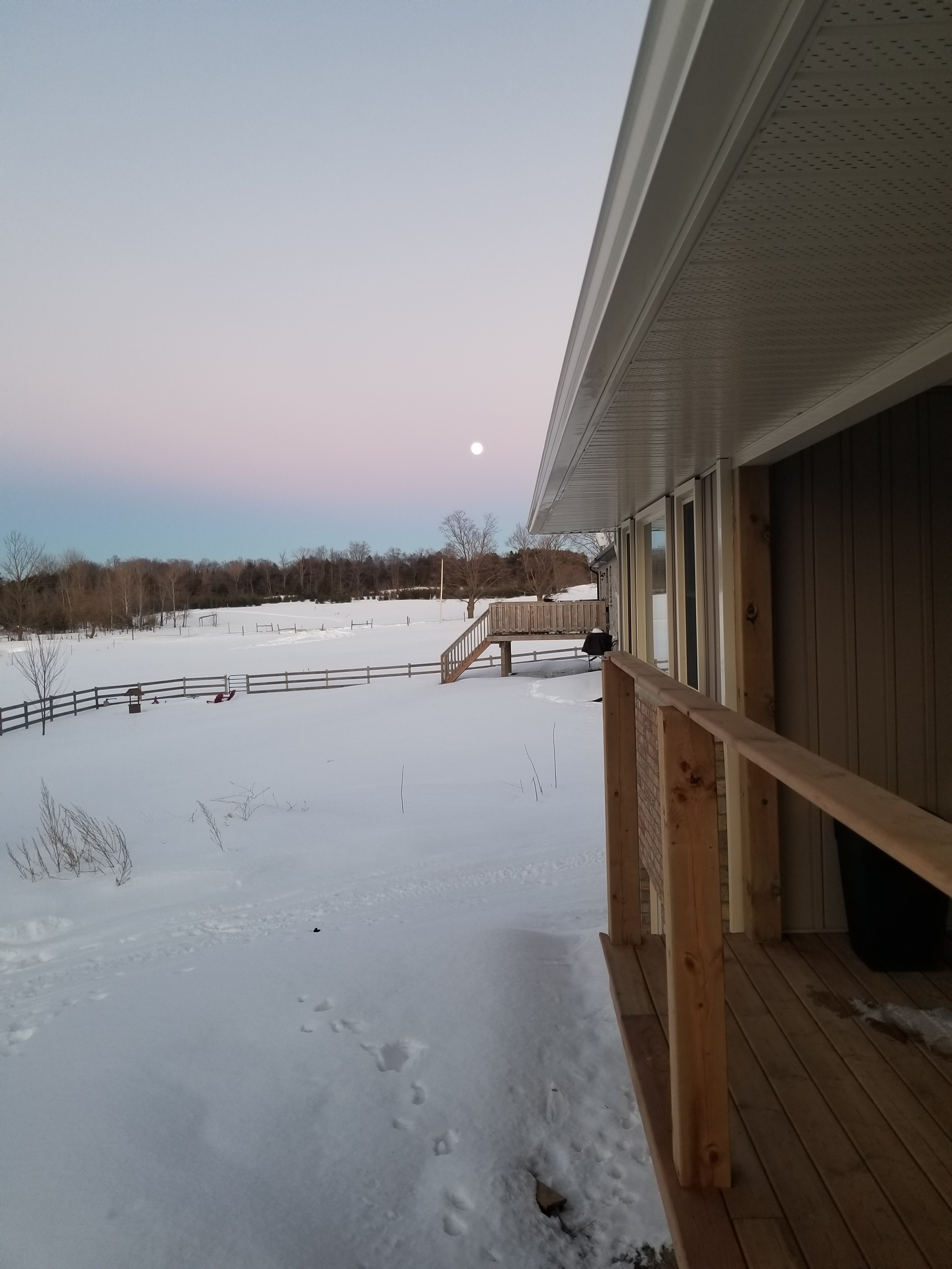 Standing on our deck to the left, the beautiful sunset and to the right a bright strong vibrant moon in the early night sky.